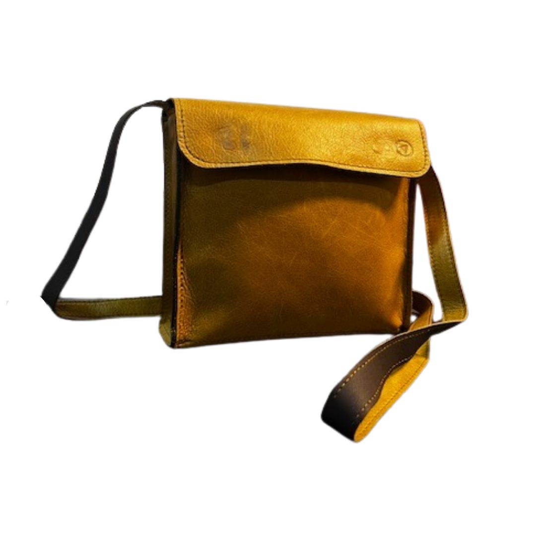 This is a leather bag featuring a double snap closure and a long shoulder strap. The design is structured for added durability.