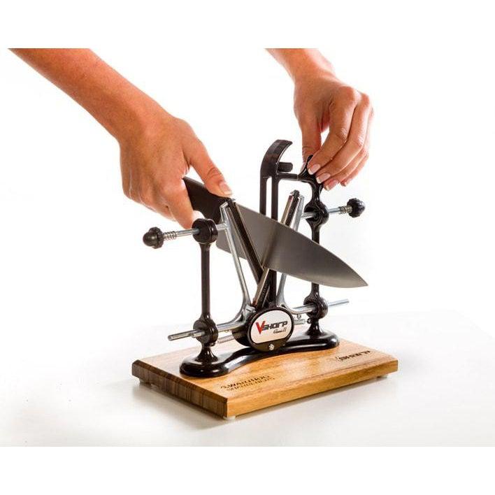 The V-SHARP® CLASSIC II ELITE is the same extremely popular Classic II with an added wooden base to make sharpening even easier! It uses two high quality, 325 grit diamond rods that sharpen the blade on both sides simultaneously using calibrated Spring Tension. Ideal for Kitchen, Fillet, Hunting and most other flat-blade knives. This high-quality model has durable powder coat finish.